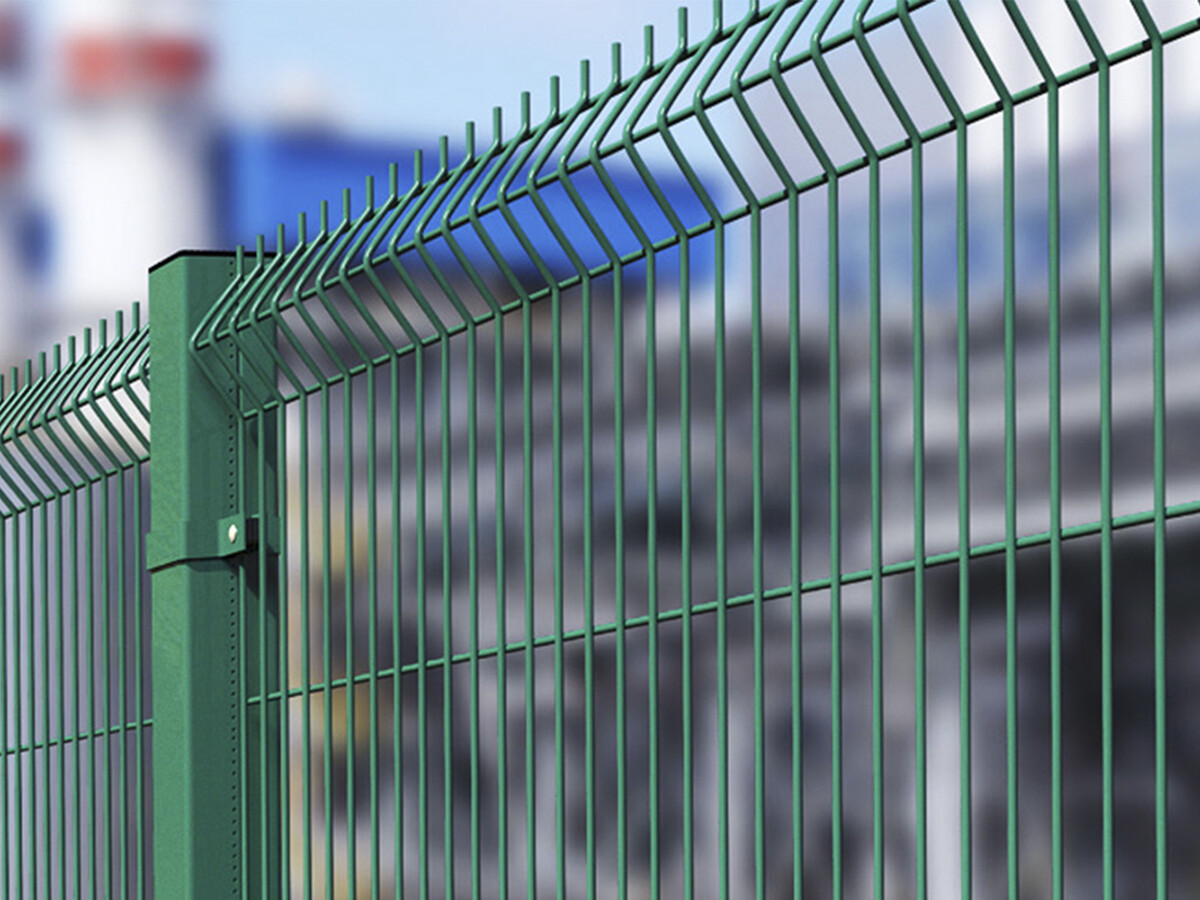 3D ограждение представляет собой сварную сетку из металлических прутьев, диаметр которых варьируется от 35 до 5 мм. Вертикальные изогнутые прутья крепко привариваются к горизонтальным, что обеспечивает особую прочность и жесткость всей конструкции. Сетки между собой крепятся на металлические столбы.
