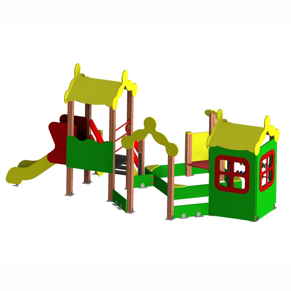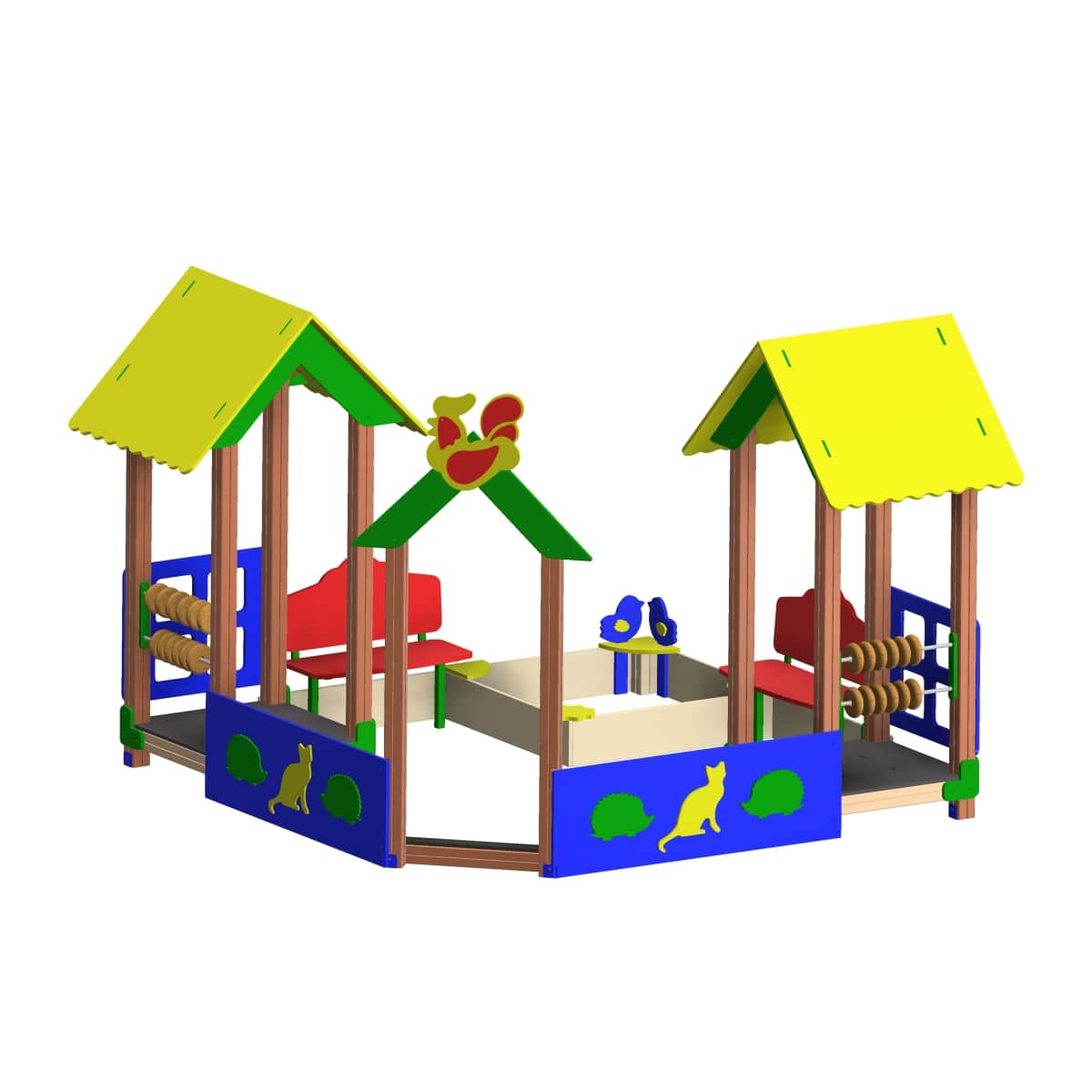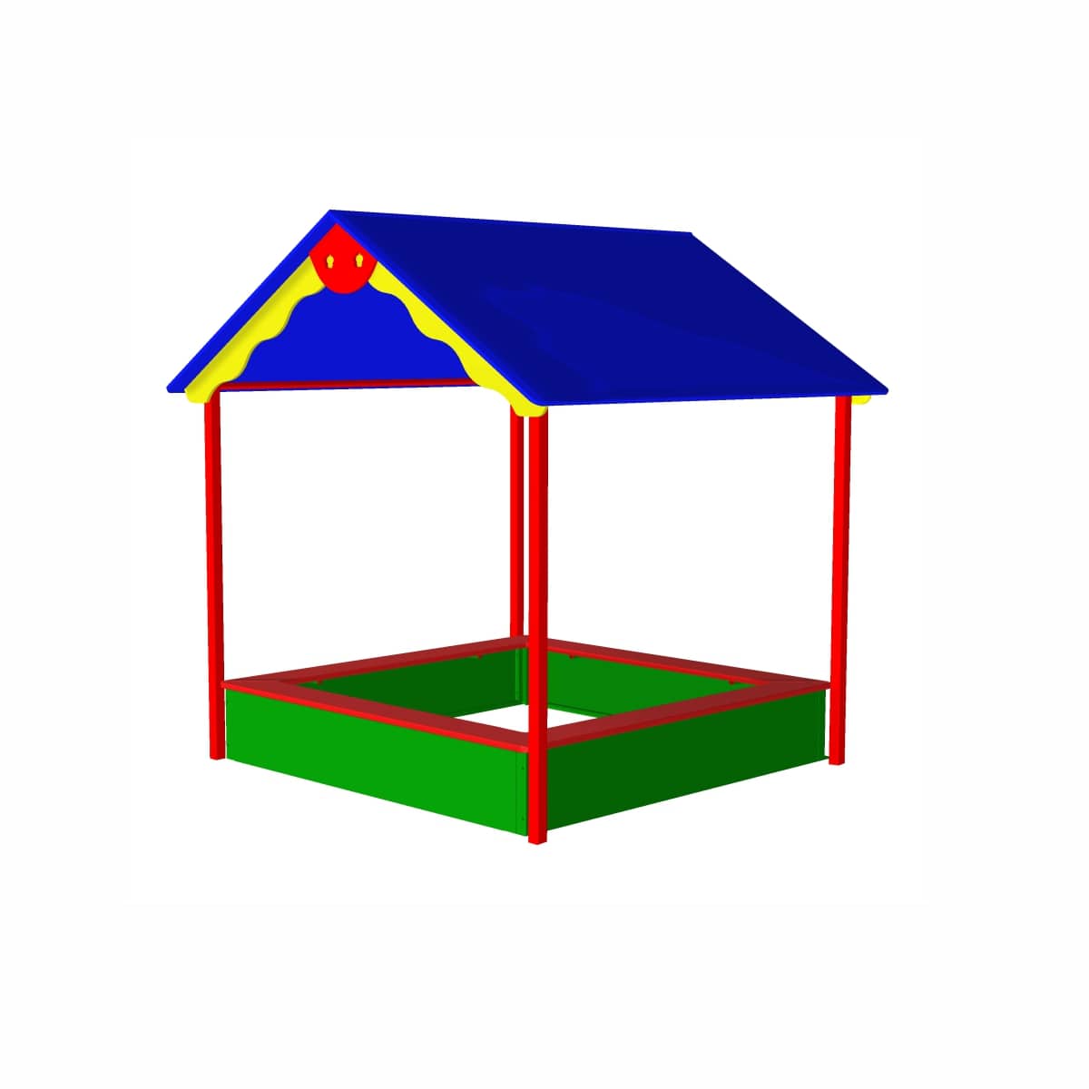 Основание песочницы изготовлено из клееного бруса сечением 100*100 мм. Сиденье песочницы расположено на высоте не более 300 мм от поверхности площадки, выполнено в виде прямоугольной формы, шириной 150 мм, из фанеры толщиной 21 мм. Борт песочницы выполнен из фанеры 12мм, волнообразной формы, толщиной 21 мм. Закладные изготовлены из профильной металлической трубы сечением не менее 25 мм. Используемая фанера должна быть водостойкой, марки ФСФ, из лиственных пород. Деревянные детали должны быть тщательно отшлифованы, кромки закруглены, должны быть обработаны морилкой по дереву с целью защитить от негативных воздействий окружающей среды. Фанера окрашена яркой водно-дисперсионной акриловой эмалью,предварительно обработана грунтовкой, стойкой к сложным погодным условиям, истиранию, действию ультрафиолета и специально предназначенными для применения на детских площадках, крепеж оцинкован. Металлические элементы окрашены яркими порошковыми красками с предварительной антикоррозийной обработкой. Выступающие концы болтовых соединений должны закрываться пластиковыми заглушками.