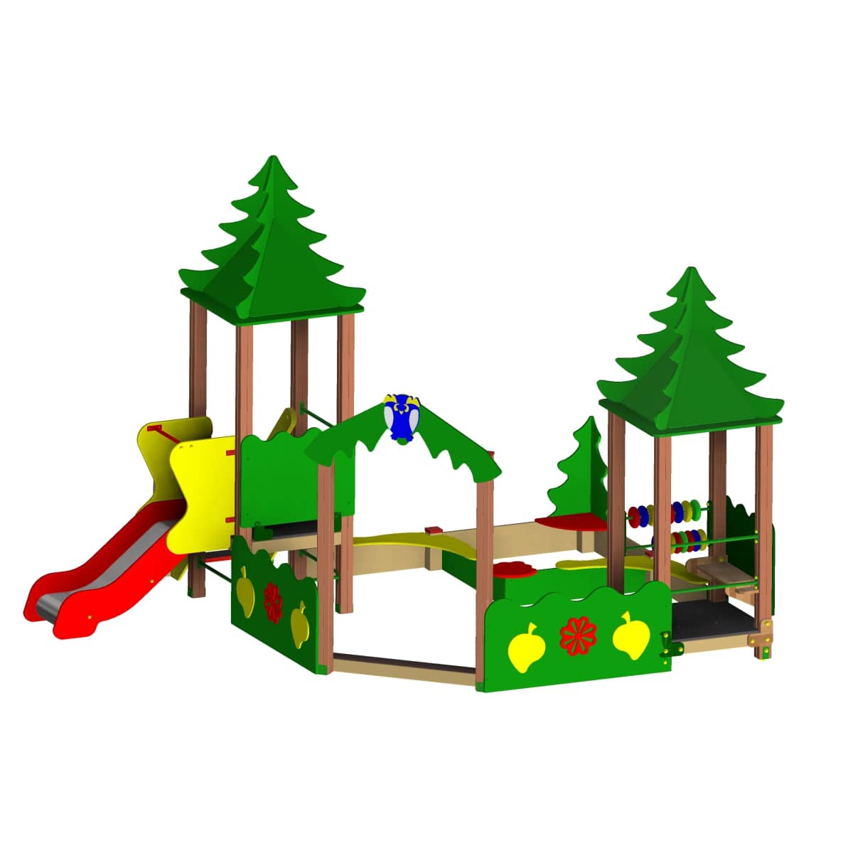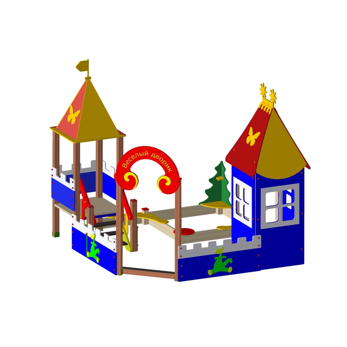 Деревянные детали должны быть тщательно отшлифованы, кромки закруглены и окрашены яркой водно-дисперсионной акриловой эмалью, стойкой к сложным погодным условиям, истиранию, действию ультрафиолета и специально предназначенными для применения на детских площадках, крепеж оцинкован. Металлические элементы окрашены яркими порошковыми красками с предварительной антикоррозионной обработкой.